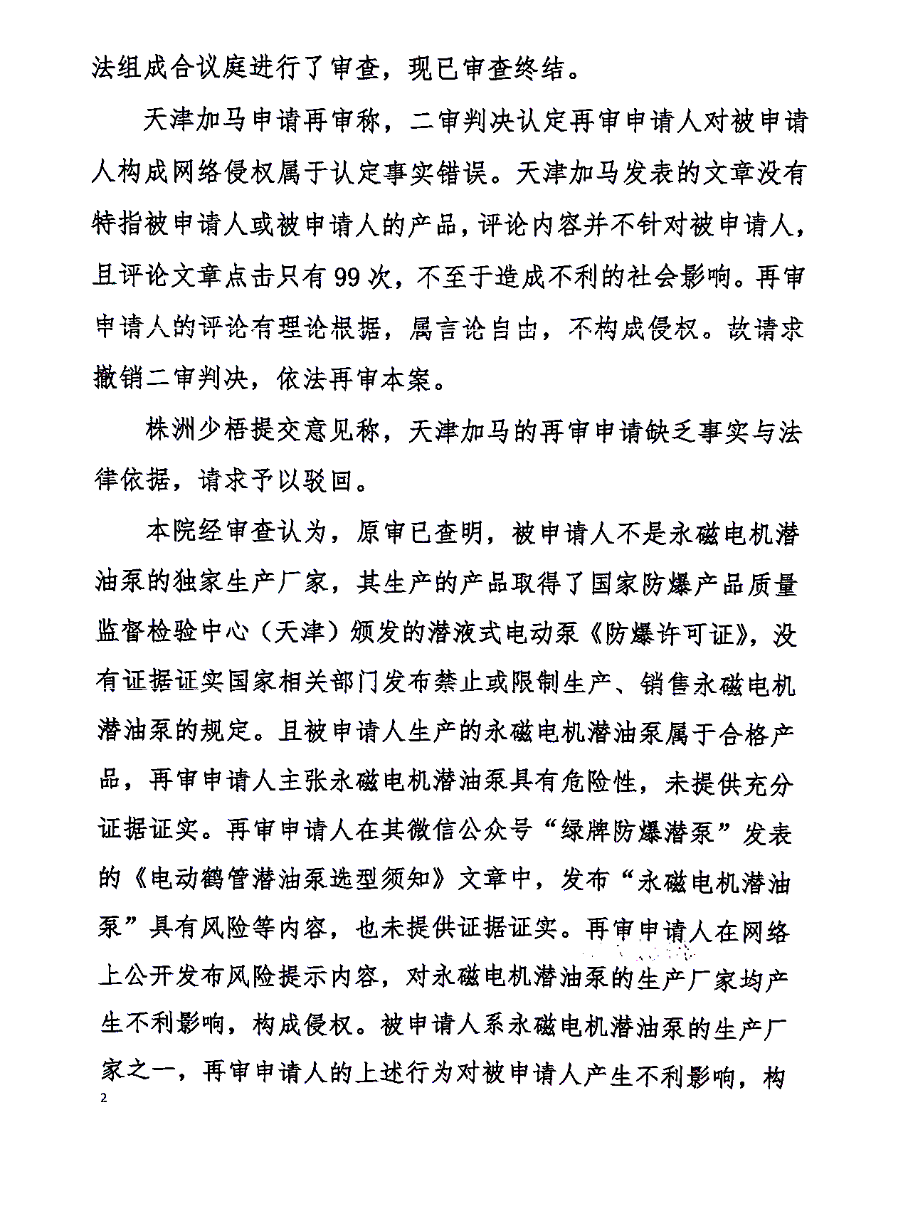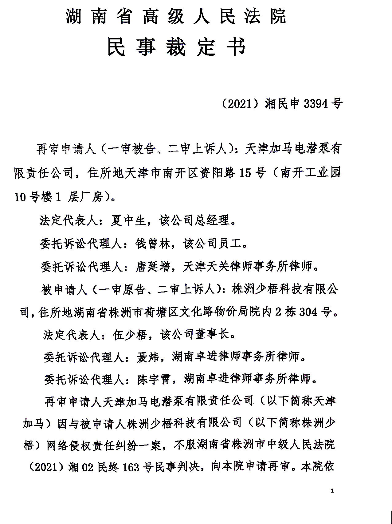 再審申請(qǐng)人天津加馬電潛泵有限責(zé)任公司(以下簡(jiǎn)稱(chēng)天津加馬)因與被申請(qǐng)人株洲少梧科技有限公司(以下簡(jiǎn)稱(chēng)株洲少梧)網(wǎng)絡(luò)侵權(quán)責(zé)任糾紛一案,不服湖南省株洲市中級(jí)人民法院(2021)湘02民終163號(hào)民事判決,向本院申請(qǐng)?jiān)賹彙1驹阂婪ńM成合議庭進(jìn)行了審查,現(xiàn)已審查終結(jié)。