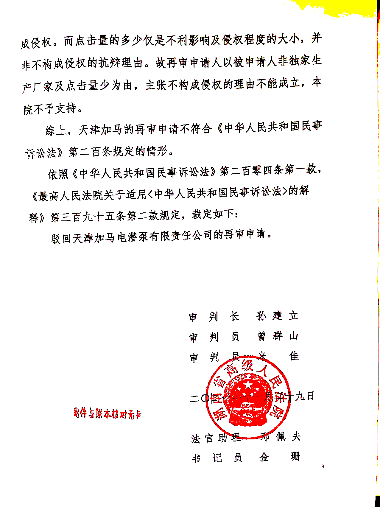 依照《中華人民共和國(guó)民事訴訟法》第二百零四條第一款,《最高人民法院關(guān)于適用<中華人民共和國(guó)民事訴訟法>的解釋》第三百九十五條第二款規(guī)定,裁定如下:駁回天津加馬電潛泵有限責(zé)任公司的再審申請(qǐng)。